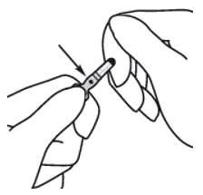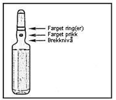 Hold tommelen på prikken og brekk av ampulletoppen, mens den andre delen av ampullen holdes godt i hånden.