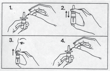 Puss først nesen og før deretter flasken loddrett inn i neseboret. Trykk én gang. Hodet skal ikke være tilbakebøyd under sprayingen. Du bør sitte og puste forsiktig gjennom nesen.
