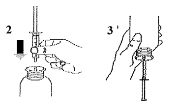 Ta sprøyten, fjern tuppen og sett sprøyten inn i adapteråpningen (figur 2). Snu flasken opp ned (figur 3).