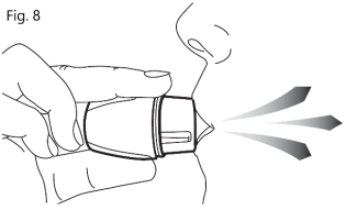 7. Inhalasjon Hold pusten neste gang du puster inn og ha hodet i en oppreist posisjon, og lukk leppene dine tett rundt munnstykket. Inhaler så sakte og dypt som mulig (Fig. 8). Du vil høre den vibrerende lyden av kapselen som roterer inni kapselkammeret for å spre legemidlet. Pust inn helt til lungene er fulle; hold deretter pusten så lenge det er behagelig og ta samtidig Vertical-Haler ut av munnen. Pust som normalt igjen. Gjenta trinn 6 og 7 én gang til. Du må puste inn to ganger fra samme kapsel. |