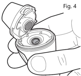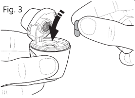 3. Sett inn kapselen Hold den åpnede Vertical-Haler loddrett. Sett inn kapselen i kapselkammeret (Fig. 3). Merk: Kapselen skal kun fjernes fra blisterpakningen umiddelbart før bruk av inhalatoren. |