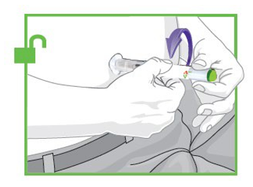 Hvis jeg låser opp pennen og trykker inn den grønne injeksjonsknappen før jeg tar av bunnhetten?