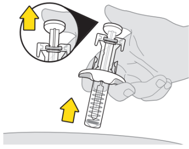 Sørg for å skyve stempelstangen helt ned for å få med alt legemiddel og utløse kanyleskjoldet.
