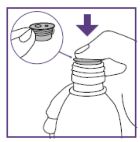 a. Hold flasken i en opprett posisjon. Før tuppen av den blå sprøyten helt inn i adapteråpningen