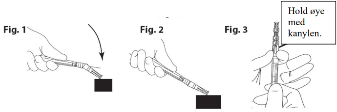 Åpne Hypodermic sprøyte og kanyle med sikkerhetshette. Trekk av folien og ta ut utstyret. Fest en sprøyte (hvis den ikke allerede sitter på) til Luerkoblingen på utstyret med en lett skrubevegelse. Fest kanylen fast på utstyret ved å trykke og så vri med klokken; sikkherhetshetten kan så trekkes rett av kanylen. Dersom instruksjonene ikke følges, kan det føre til skade fra sprøytestikk.