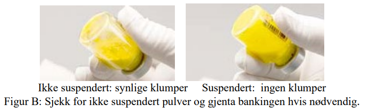 10. Kontroller at det ikke er klumper i hetteglasset. Pulver som ikke er suspendert ses som gule, tørre klumper som festes på glassveggen. Ytterligere banking kan være nødvendig dersom det fortsatt er klumper (se figur B).