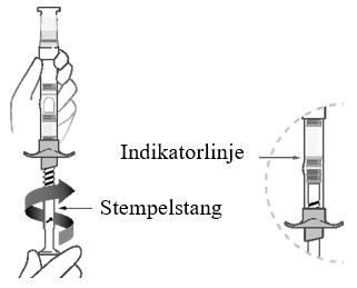 a) Skyv stempelet litt ned for å få tak i gjengene. Roter deretter stempelstangen til stangen slutter å rotere, for å frigjøre fortynneren. Etter at stempelstangen har stoppet helt, vil den midterste stopperen være på indikatorlinjen.