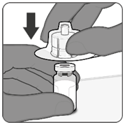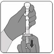 Bruk en steril kanyle og steril sprøyte, og trekk opp hele innholdet fra hetteglasset med oppløsningsvæsken og injiser hele innholdet i sprøyten ned i hetteglasset med pulveret.