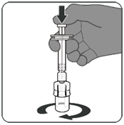 Injiser hele innholdet i sprøyten ned i hetteglasset. Hold stempelstangen nede, og snurr hetteglasset forsiktig til pulveret er helt oppløst. Skal ikke ristes.