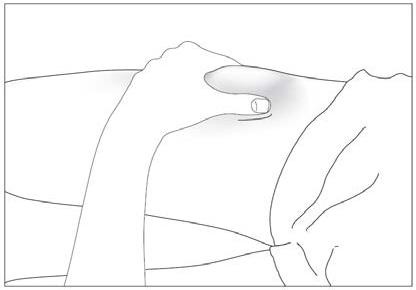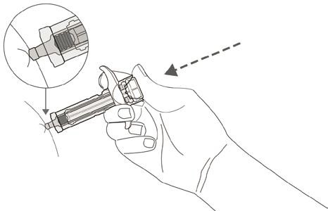 Nålebeskyttelsen dekker nålen etter injeksjonen for å forhindre nålestikkskade. Dette påvirker ikke normal bruk av sprøyten. Trykk ned stempelstangen og trykk bestemt på slutten av injeksjonen for å forsikre at sprøyten tømmes helt. Hold godt fast i huden til injeksjonen er fullført. Hold sprøyten i ro og løft tommelen langsomt fra stempelstanghodet. Stempelstangen flyttes opp med tommelen, og fjæren trekker nålen ut fra stedet og inn i nålebeskyttelsen.