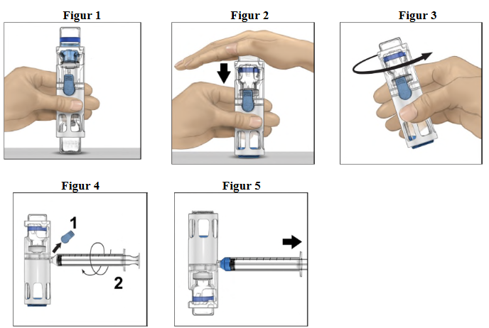 Kontroller at all oppløsningsvæsken er overført. Virvle forsiktig til alt materialet er oppløst (figur 3). Sørg for at pulveret løser seg helt opp, ellers vil ikke hele den rekonstituerte oppløsningen passere gjennom filteret i enheten. Legemidlet løser seg opp raskt (vanligvis på under 1 minutt). Etter rekonstituering skal oppløsningen være klar, fargeløs og uten fremmedpartikler.