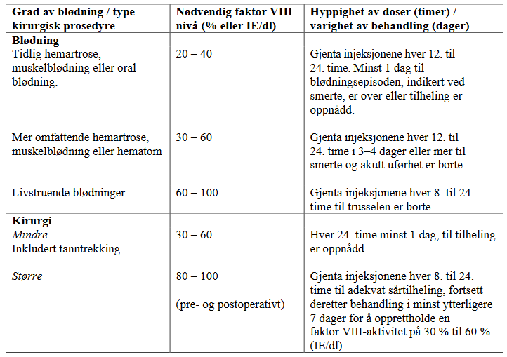 I følgende blødningstilfeller skal faktor VIII-aktiviteten ikke synke under det oppgitte plasmaaktivitetsnivået (i % av det normale eller IE/dl) i den tilsvarende perioden. Tabellen nedenfor kan brukes som retningslinje for dosering ved blødningsepisoder og kirurgi.