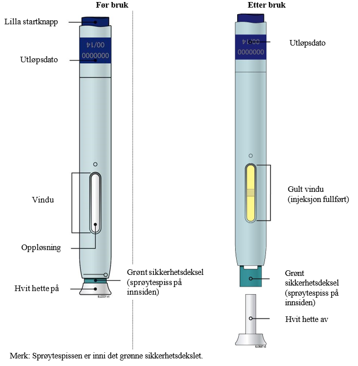 Når du er klar til å injisere, trekk hetten rett av. Injeksjonen må administreres innen 5 minutter. Det er normalt å se en væskedråpe i enden av kanylen eller sikkerhetsdekslet.