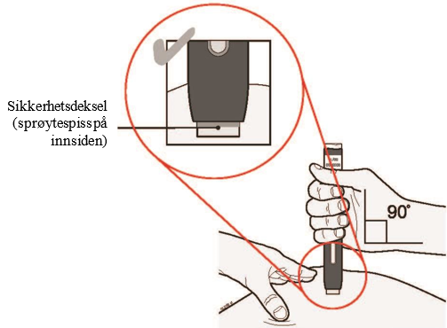 Fortsett å holde huden strukket/sammenklemt. Med hetten av, plasser pennens sikkerhetsdeksel på huden i en vinkel på 90 grader. Sprøytespissen er inni sikkerhetsdekslet