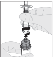 12. Med sprøyten fortsatt festet til adapteren og stempelstangen presset ned, roter hetteglasset forsiktig til pulveret er oppløst.