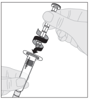 Merk: Dersom oppløsningen ikke skal brukes med én gang, kan sprøytehetten settes forsiktig tilbake på sprøytetuppen. Ikke berør sprøytetuppen eller innsiden av hetten.