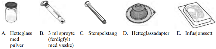 Se andre siden av pakningsvedlegget for instruksjoner for klargjøring og administrasjon.