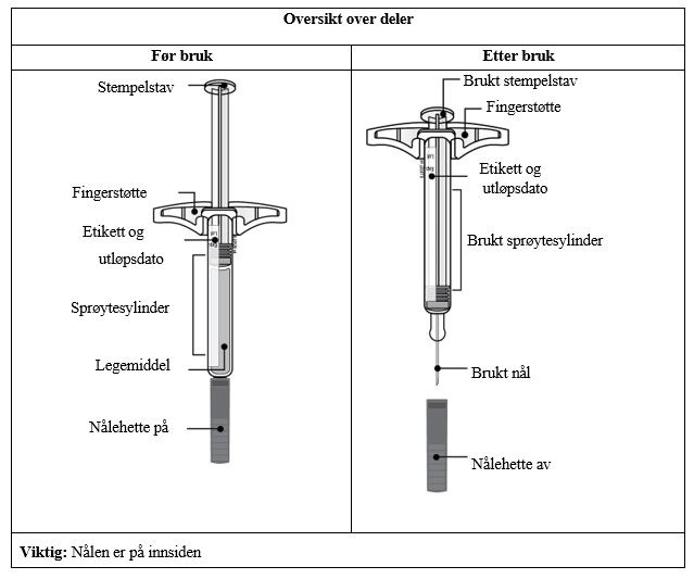Hver pakke inneholder 1, 2, 4 eller 6 40 mg ferdigfylte sprøyter til engangsbruk (med blå stempelstav).