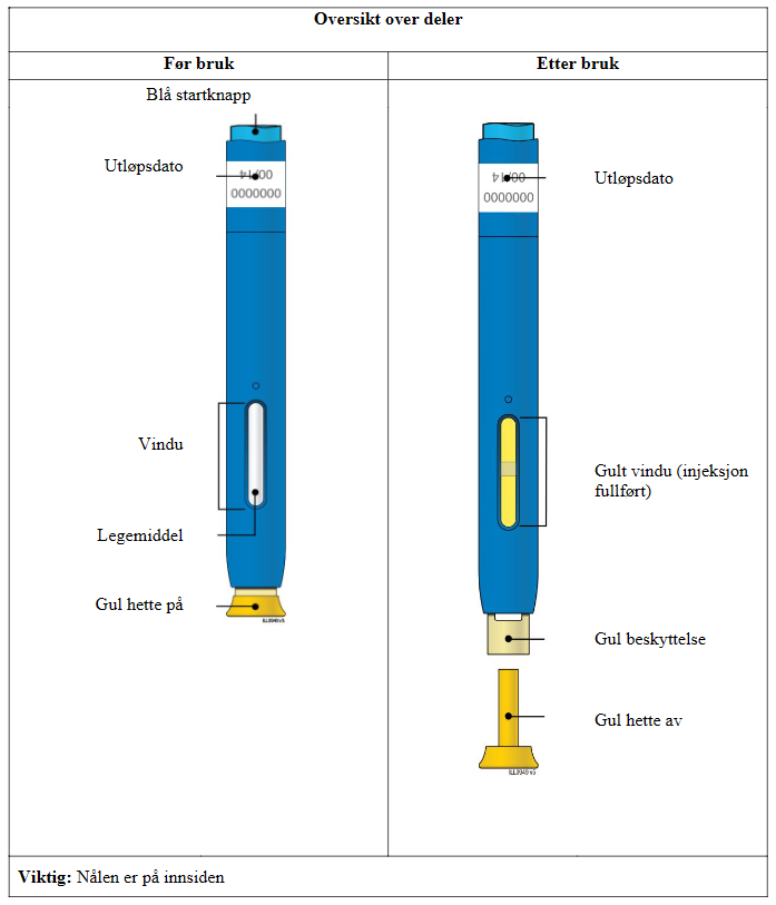 Viktig: Hvis vinduet ikke har blitt gult eller det ser ut som om legemidlet fremdeles injiseres idet du fjerner den ferdigfylte pennen, betyr det at du ikke har fått en hel dose. Kontakt lege øyeblikkelig.