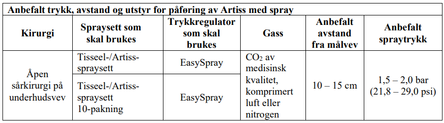 Ved påføring av Artiss med sprayutstyr må du sørge for å bruke et trykk og en avstand fra vev som er innenfor områdene som anbefales av leverandøren som følger: