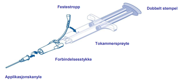 Før påføring kobles den bruksklare sprøyten med to kamre med tetningsproteinoppløsningen og trombinoppløsningen til et forbindelsesstykke og en applikasjonskanyle - begge finnes i settet med påføringsutstyr. Det felles stempelet til den bruksklare sprøyten med to kamre sikrer at like volumer av de to vevslimkomponentene føres gjennom forbindelsesstykket og inn i applikasjonskanylen, der de blandes og deretter påføres.