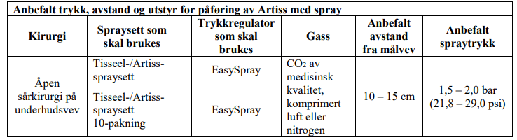 Ved påføring av Artiss med sprayutstyr må du sørge for å bruke et trykk og en avstand fra vev som er innenfor områdene som anbefales av leverandøren som følger:
