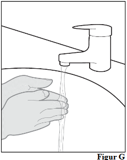 a. Vask hendene med såpe og vann, og tørk dem grundig (se figur G).