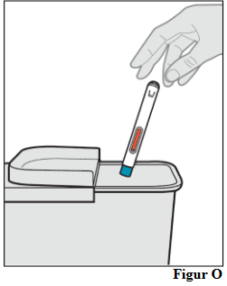 a. Kast den brukte ferdigfylte pennen i beholderen for skarpe gjenstander rett etter bruk (se figur O).