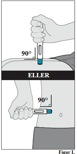b. Uten å klype i eller strekke huden plasseres den ferdigfylte pennen mot huden i 90 graders vinkel (se figur L).