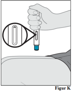a. Hold den ferdigfylte pennen komfortabelt i den ene hånden, slik at du kan se vinduet (se figur K).