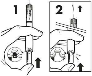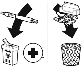 Du kan bare bruke den ferdigfylte injeksjonspennen én gang, og du må kaste pennen selv om det er mer væske igjen etter injeksjonen. Kast pakningen, den indre nålehetten, den avrivbare fliken, spritservietten og bruksanvisningen i vanlig husholdningsavfall. Legemidler skal ikke kastes i avløpsvann eller sammen med husholdningsavfall. Brukte penner skal kastes i en egnet beholder for skarpe gjenstander og returneres til apoteket for forsvarlig destruksjon. Spør på apoteket hvordan du skal kaste legemidler som du ikke lenger bruker. |