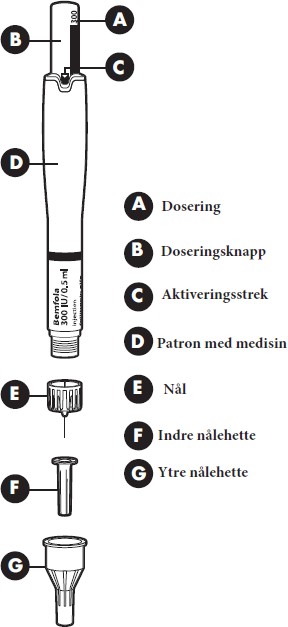 Hver ferdigfylte penn leverer 300 IE (22 mikrogram) i 0,50 ml. -