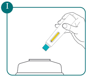 Legg den brukte ferdigfylte pennen i en avfallsbeholder for skarpe gjenstander umiddelbart etter bruk (se figur I).