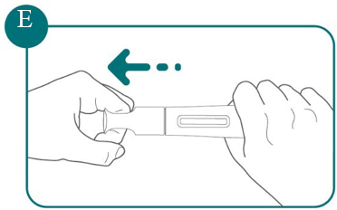 Hold den ferdigfylte pennen godt fast med én hånd rundt håndtaket. Trekk hetten rett av den ferdigfylte pennen med den andre hånden (se figur E). Selv om du ikke kan se spissen på kanylen, er den nå ikke tildekket.