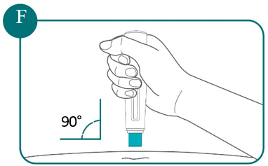 Du vil høre en klikkelyd. Injeksjonen begynner når du hører det første klikket (se figur G). Ikke løft den ferdigfylte pennen bort fra huden.