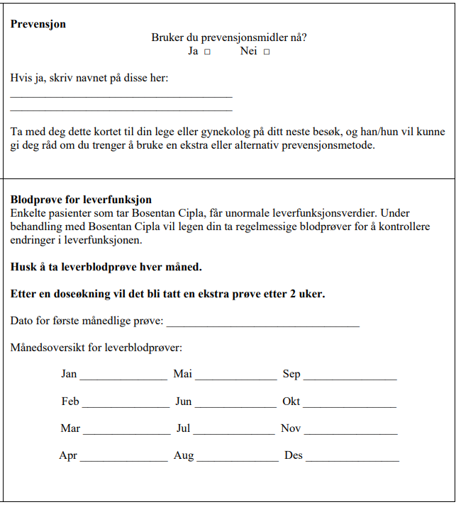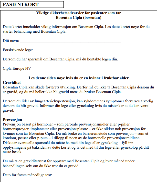 hormonelle prevensjonsmidler, som brukt alene ikke er tilstrekkelig effektive når du bruker Bosentan Cipla. Inne i pakningen med Bosentan Cipla vil du finne et pasientkort som du bør lese nøye. Legen din og/eller gynekologen vil foreslå prevensjon som er egnet for deg.