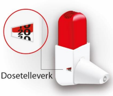 Dosetelleren viser hvor mange doser som er igjen. Telleren flytter seg for hvert femte trykk. Når dosetellereren begynner å bli rød, er det 20 doser igjen.