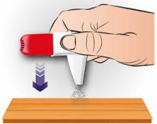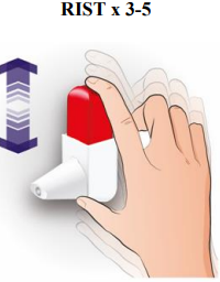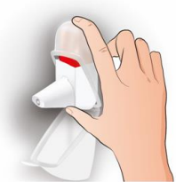 Hvordan tømme pulveret ut av munnstykket Dersom du ved uhell utløser inhalatoren eller du har utløst den mer enn én gang, eller hvis du puster rett inn i den, skal du tømme munnstykket.