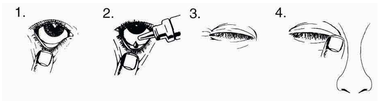Får å forebygge infeksjon, ikke la flaskespissen berøre øyet eller noe annet. Sett skrukorken på plass for å lukke flasken straks du har brukt den.
