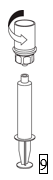 9. Nå som oppløsningen er overført til sprøyten, hold godt rundt sprøyten (sprøytestemplet skal peke nedover) og skru den gjennomsiktige Mix2Vial adapteren løs fra sprøyten ved å skru mot klokken.