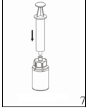 7. Trekk luft inn i en tom, steril sprøyte. Mens hetteglasset med preparat står oppreist, kopler du sprøyten til Mix2Vial adapterens Luer-Lock-tilpasning ved å skru med klokken. Press luft inn i hetteglasset.