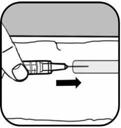 Trekk stemplet langsomt ut for å fylle sprøyten, til enden av stemplet er på linje med markeringen som tilsvarer din dose. Hold nålespissen i væsken hele tiden. |