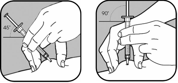 Hold sprøyten mellom tommel og pekefinger på den hånden du bruker mest. Nålen skal føres inn i huden i en vinkel på 45º eller 90º. Helsepersonell vil vise deg hvilken vinkel du skal bruke. |