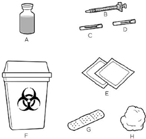 B. Én sprøyte med stempel C. Én stor sprøytenål til å trekke opp CRYSVITA D. Én liten sprøytenål til injeksjon av CRYSVITA E. Injeksjonstørk F. Beholder til skarpe gjenstander G. Plaster (ved behov) H. Kompress eller bomullsdott
