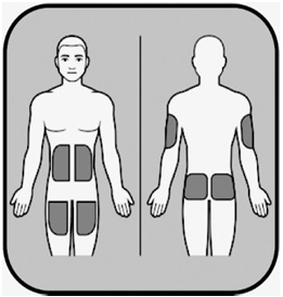 Du skal velge et injeksjonssted. Dersom du skal sette injeksjonen på deg selv, er egnede områder: