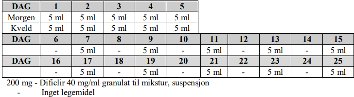 Anbefalt dose til pasienter som veier minst 12,5 kg er 200 mg (5 ml mikstur, suspensjon) administrert to ganger daglig (én gang hver 12. time) i 10 dager (se plan 1 nedenfor).