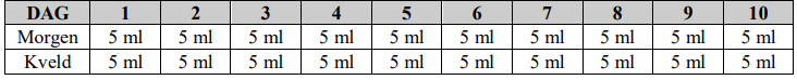 Det er mulig at legen har forskrevet en alternerende dosering. Anbefalingen for en alternerende dosering er administrasjon to ganger daglig for dag 1-5. Du skal ikke ta noen suspensjon på dag 6. Deretter skal du ta suspensjon én gang daglig annenhver dag for dag 7-25 (se også plan 2 nedenfor).