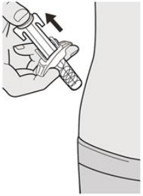 Løft tommelen fra stempelet for å frigi nålbeskyttelsen, vent til nålen er dekket av nålebeskyttelsen. Fjern deretter sprøyten fra injeksjonsstedet.