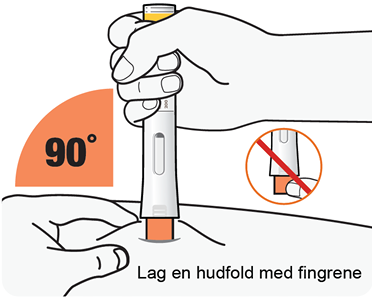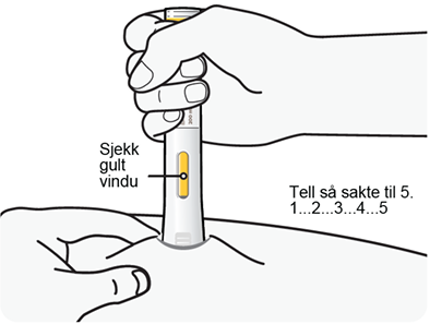 Trykk den ferdigfylte pennen bestemt mot huden til du ikke ser den oransje nålebeskyttelsen, og hold den fast slik.