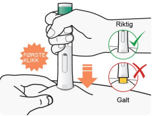 Trykk den ferdigfylte pennen bestemt mot huden til du ikke ser den gule nålebeskyttelsen, og hold den fast slik.